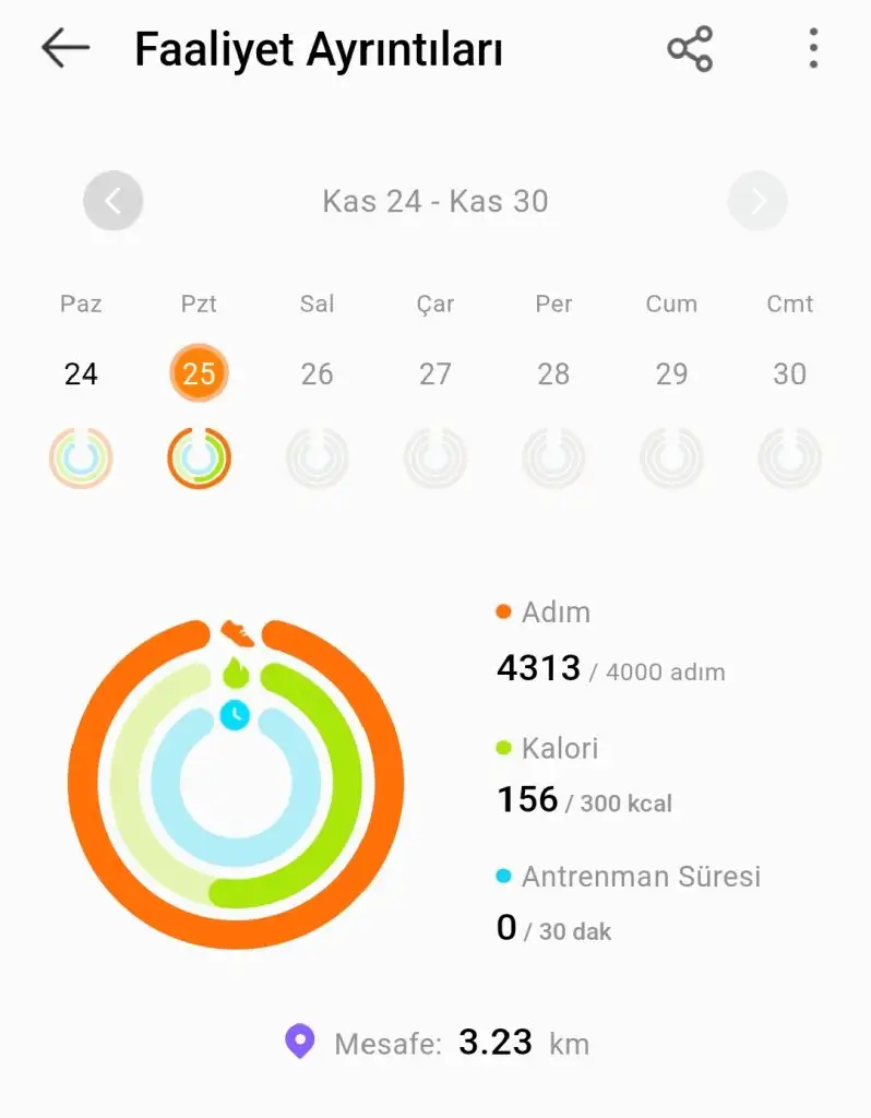 Adım sayısı 7500 ( koşu bandındaki adımlar dahil değil, telefon üstümde olmuyor.)