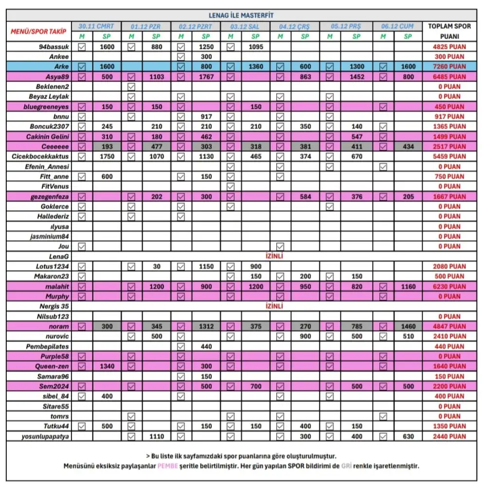 Ellerine sağlık boncuğumBu haftanın da sonuna geldik bu haftanın da kazanıarke oluyooorr veee hem kendine hem takımına +1 puan kazandırıyor. Bizden de 1adet ETİ KARAM GURME kazanıyor (istediğin çikilatayla değiştirebilirsin şekerim) azminden dolayı tebrik ediyoruz. Pembe şerit eksiksiz menü, gri işaretli yerler eksiksiz spor paylaşımını belirtiyor canımlar. (Sadece 2 kişi eksiksiz spor yapmış ayrıca tebrik ediyorum sizleri)
