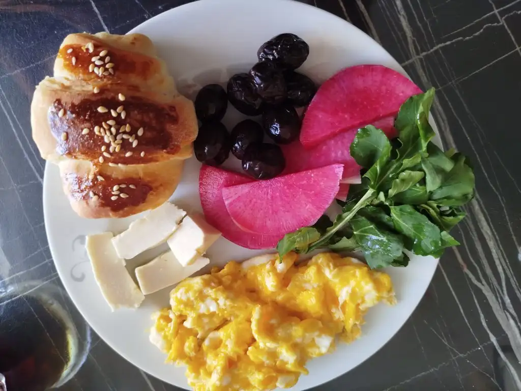 11de 2 minik parça krep, 1 haşlanmış yumurta, haşlanmış Yumurtanin sarısı, zeytin, 1 minik domates, kadar, az zeytinyaginda kavrulmuş patlican biber , yarım dilim.limonlu kek