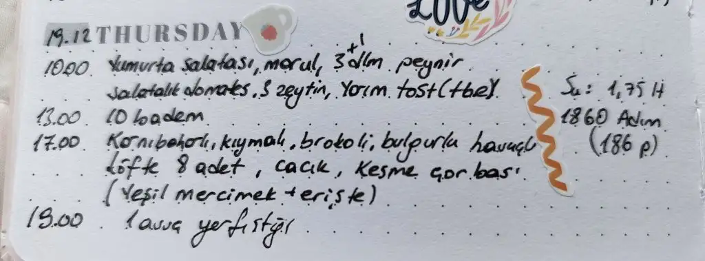 16.30da 4 kaşık bulgur pilavı, 4 kaşık nohut yemeği, 3 kaşık kavrulmuş et , acı biber turşusu , küçük kase yoğurt 1 muz