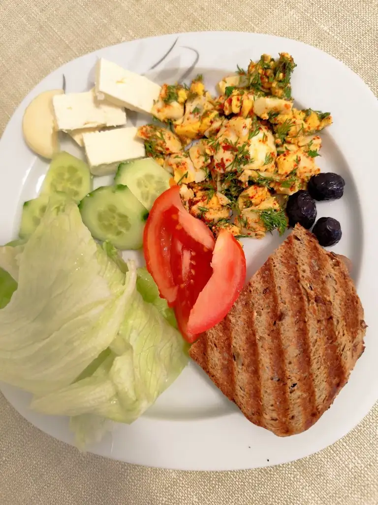 2 yumurta ile çökelekli yumurta, 1 kare bitter, kollajen kahve