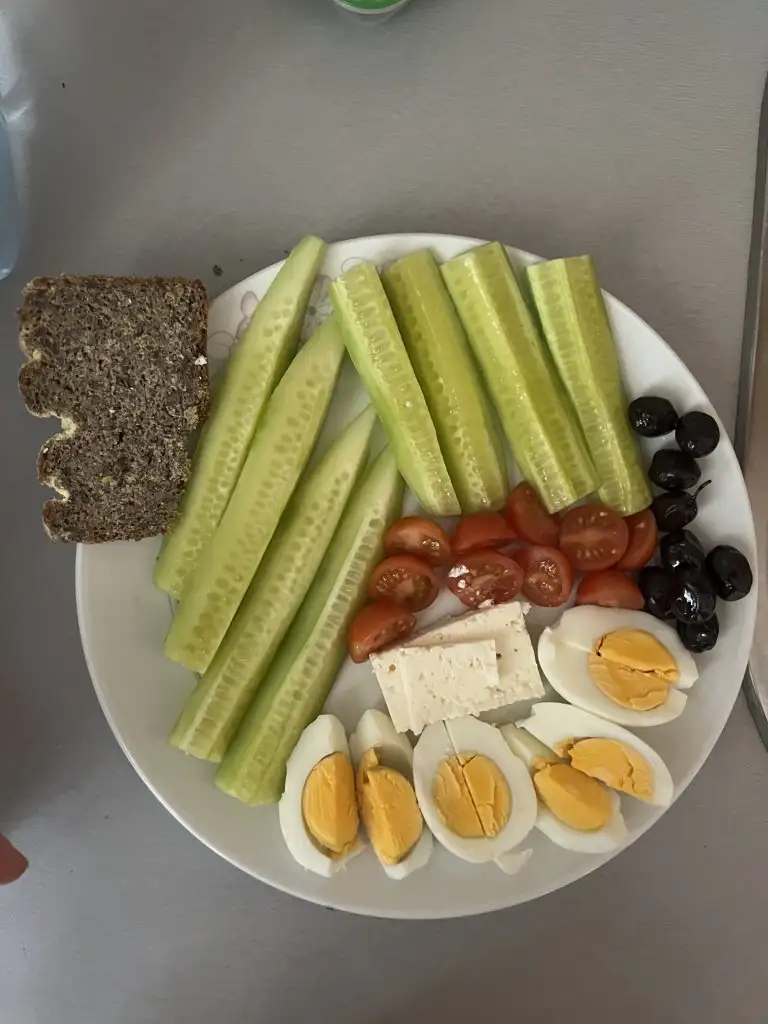 Öğlen (13:00): salatalık + domates + 2 haşlanmış yumurta + 1 dilim peynir + 8-9 zeytin + 1 dilim glutensiz ekşi maya ekmek + 1 bahçeden portakal+ hemen üstüne şekersiz kahve + 1 hurma
