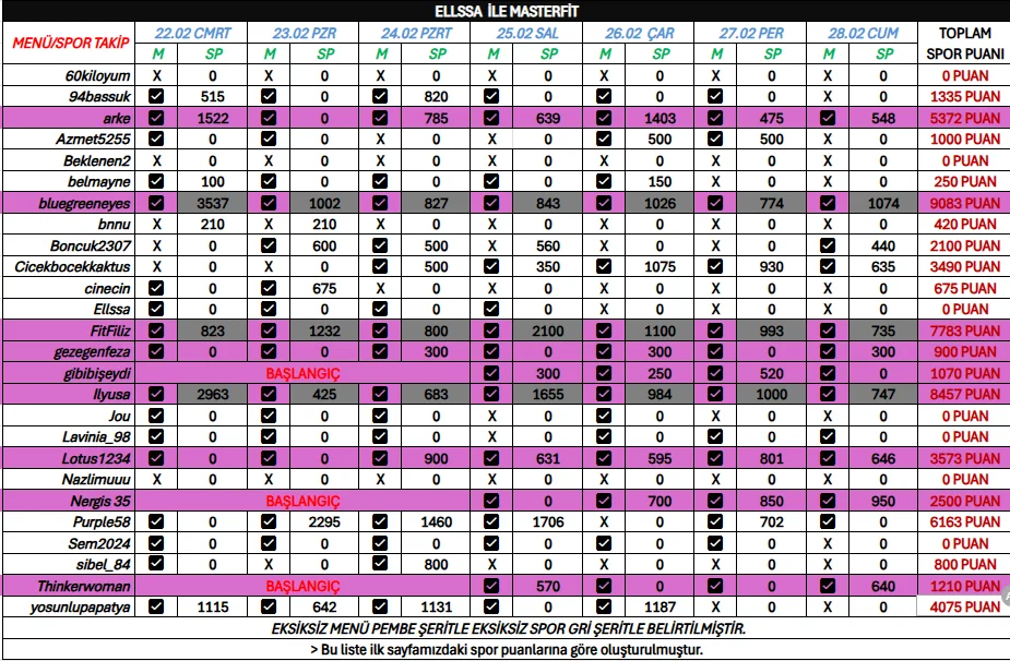 Bir haftanın daha sonuna geldik bu haftanın spor yarışı kazananıbluegreeneyes oluyooorr veee hem kendine hem takımına +1 puan kazandırıyor. Bizden de 1adet ETİ KARAM GURME kazanıyor (istediğin çikilatayla değiştirebilirsin şekerim) azminden dolayı tebrik ediyoruz. Pembe şerit eksiksiz menü, gri işaretli yerler eksiksiz spor paylaşımını belirtiyor canımlar