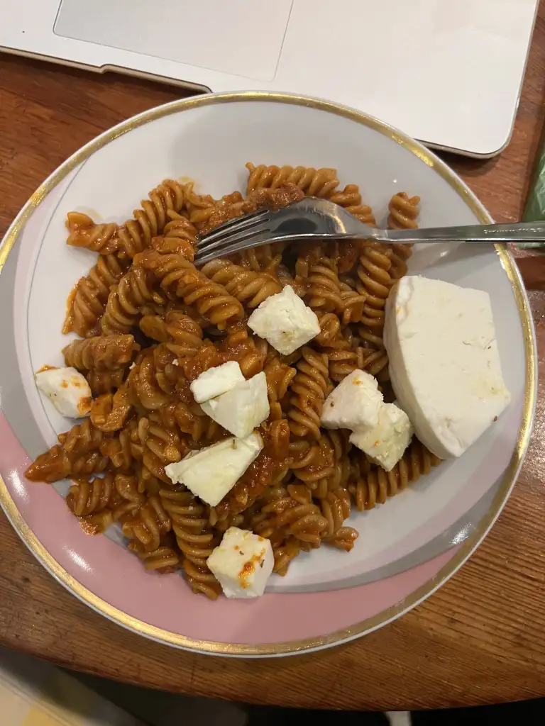 Akşam: tuzsuz tam buğday salçalı sarımsaklı makarna + üstüne maalesef yine keçi peynirinden