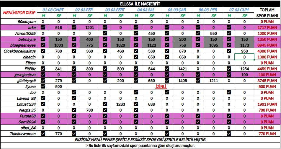Bir haftanın daha sonuna geldik bu haftanın spor yarışı kazananıbluegreeneyes oluyooorr veee hem kendine hem takımına +1 puan kazandırıyor. Bizden de 1adet ETİ KARAM GURME kazanıyor (istediğin çikilatayla değiştirebilirsin şekerim) azminden dolayı tebrik ediyoruz. Pembe şerit eksiksiz menü, gri işaretli yerler eksiksiz spor paylaşımını belirtiyor canımlar