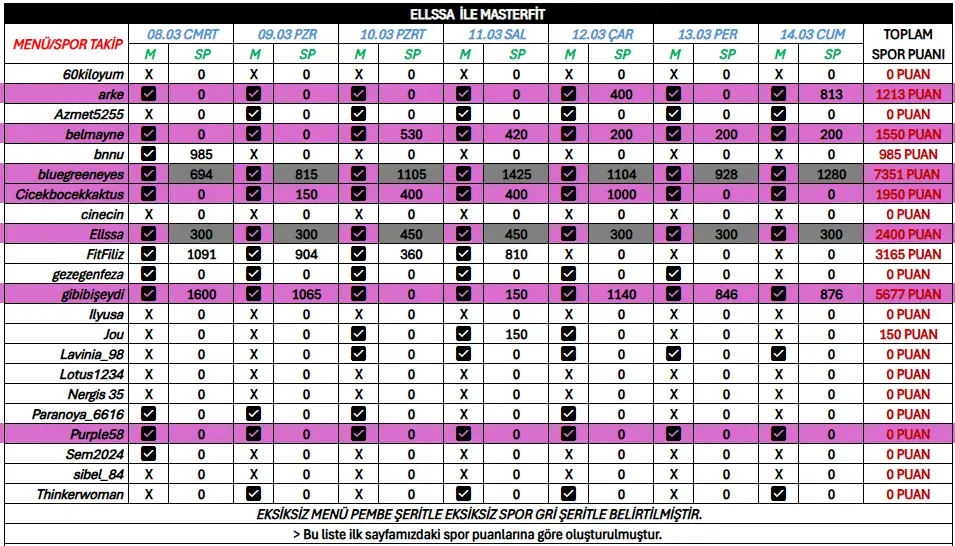 Bir haftanın daha sonuna geldik bu haftanın spor yarışı kazananıbluegreeneyes oluyooorr veee hem kendine hem takımına +1 puan kazandırıyor. Bizden de 1adet ETİ KARAM GURME kazanıyor (istediğin çikilatayla değiştirebilirsin şekerim) azminden dolayı tebrik ediyoruz. Pembe şerit eksiksiz menü, gri işaretli yerler eksiksiz spor paylaşımını belirtiyor canımlar