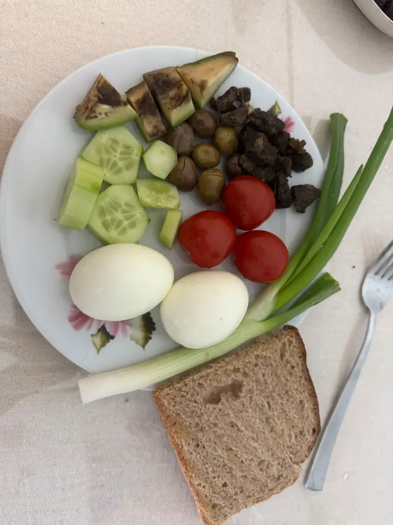Sabah 1dilim k.ekmegi 1.5 haşlama yumurta 1 dilim füme 5 çeri domates 1 salatalık 1 yesil biber 4 zeytin