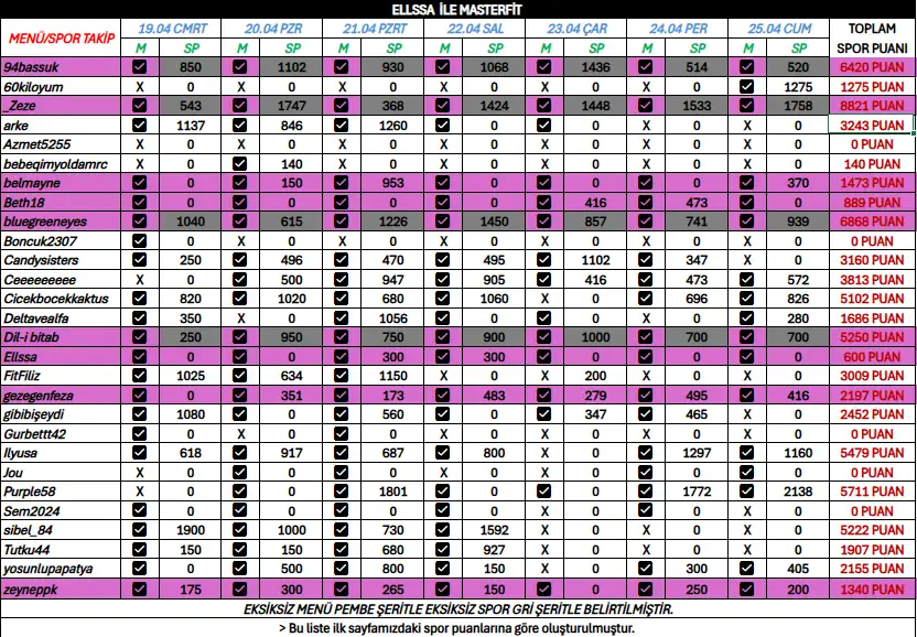 Bir haftanın daha sonuna geldik bu haftanın spor yarışı kazananıYeniFitBen oluyooorr veee hem kendine hem takımına +1 puan kazandırıyor. Bizden de 1adet ETİ KARAM GURME kazanıyor (istediğin çikilatayla değiştirebilirsin şekerim) azminden dolayı tebrik ediyoruz. Pembe şerit eksiksiz menü, gri işaretli yerler eksiksiz spor paylaşımını belirtiyor canımlar