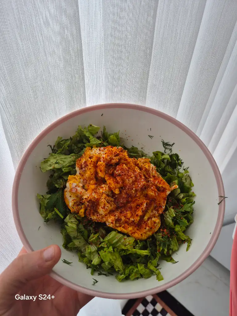 Bol karışık kıvırcık salata ve pulbiberli 2 yumurta kırılmış zeytinyağında