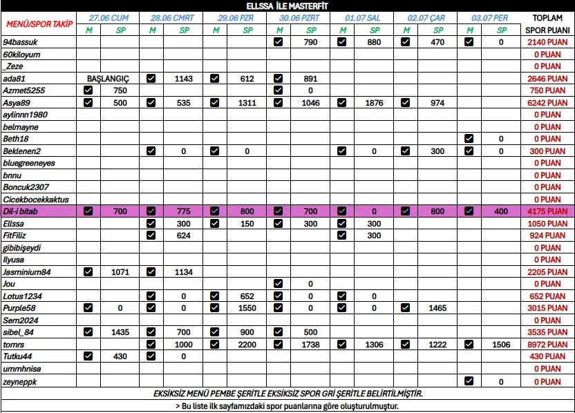 | KIRMIZI TAKIM | 27.06.2025 | 04.07.2025 | FARK | ORAN |