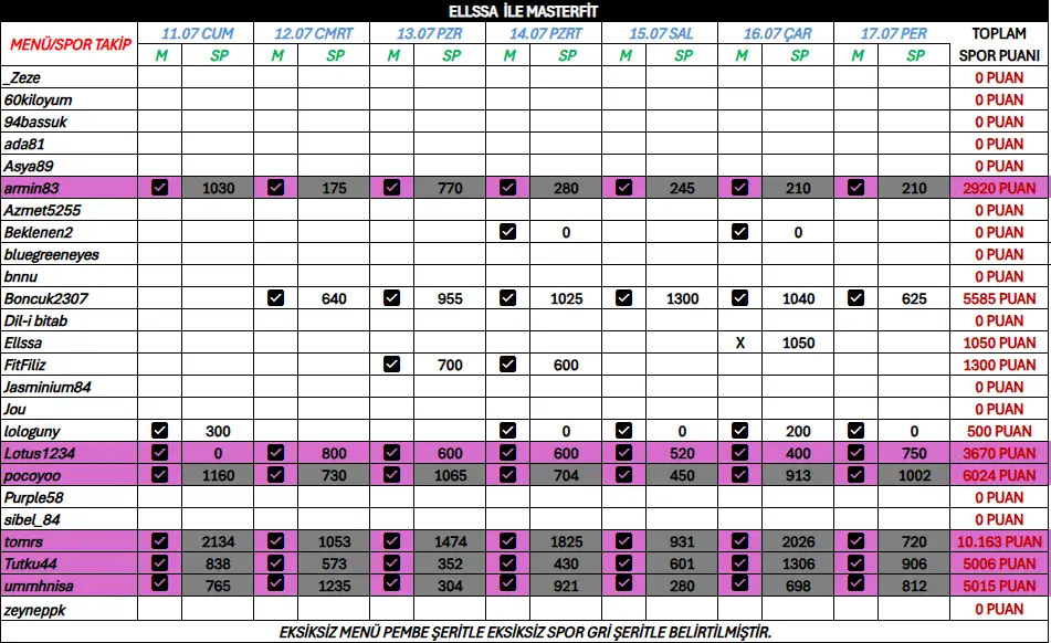 Lig tablosu etap sonunda (18.07.2025) sadece bildirim yapan arkadaşlarımızı kapsamaktadır. Aynı kiloda olma durumunda önce yüzde oranına bakılmaktadır.
