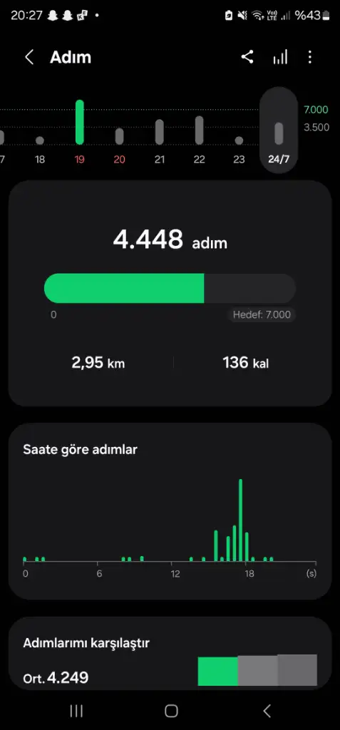 Adım sayısı: benim uygulamada sıkıntı oldu. En son ekranda gördüğüm 4300 adımdı. 5 bini tamamlamisimdir diye düşünüyorum.Bugün de sıkıntı var. Artık saat tutup yürüyüş yapacağım. Yürüyüşümü dakika olarak bildireceğim kaptanlarim