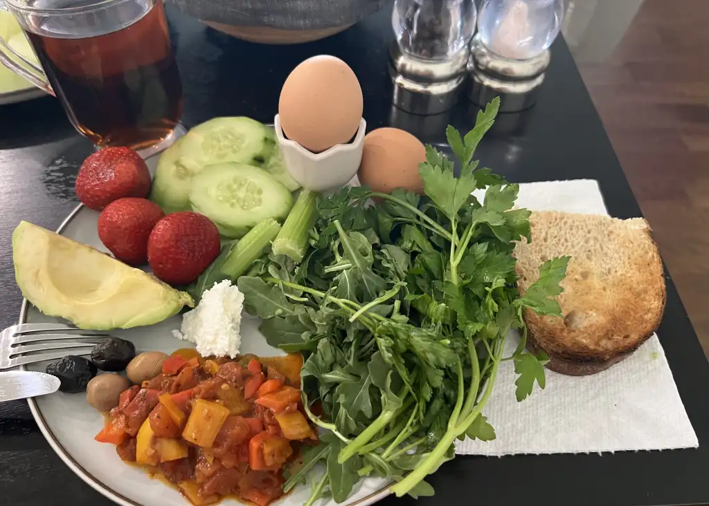 Bir dilim tb ekmeği, 2yk menemen,bir haşlanmış yumurta,yarim kapya biber ,bol yeşil biber, 5 zeytin,bir ceviz, 3lokma kavun, bir lokma peynir