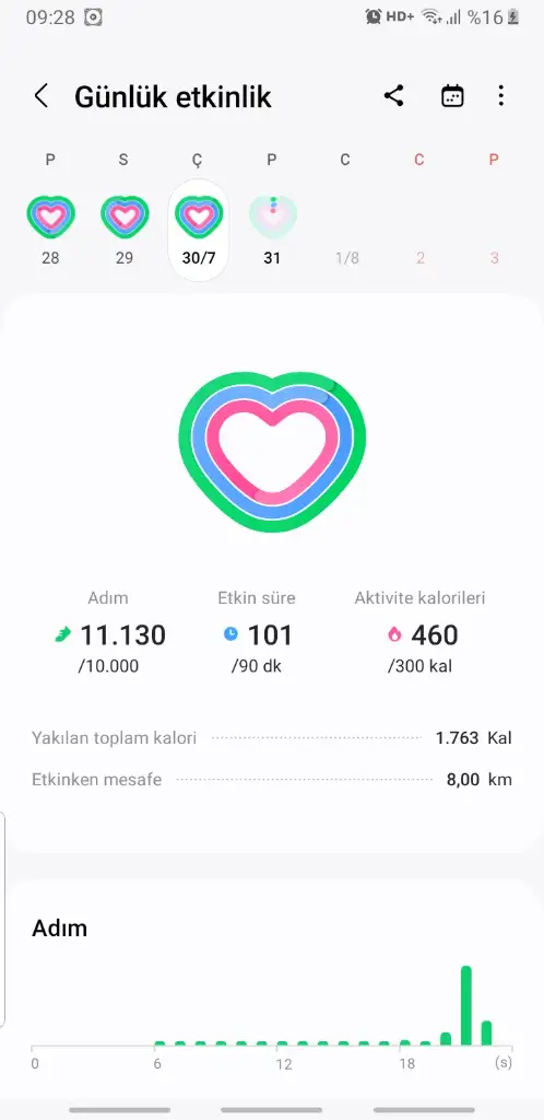 Spor: öğlen salonda bir saat spor yaptım ve akşam da yürüdüm