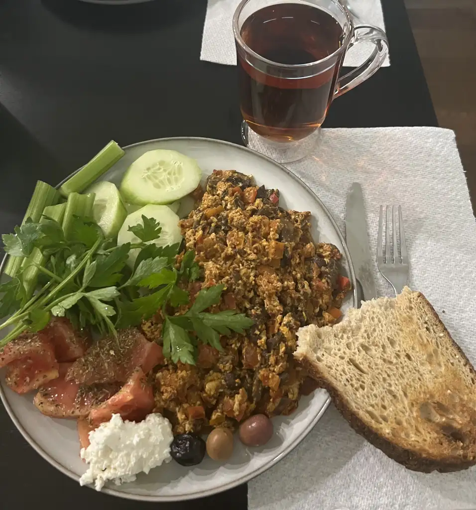 Kahvalti (Kapya biber, 5mantar,1 domates ve 2 yumurta ile sebzeli yumurta, yesilikler, sebzeler, zeytin,peynir, ekmek) 450kalori