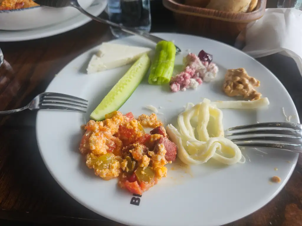Kahvaltı : sucuklu menemen biraz şarküteri fıstık ezmesi porsiyonlar çok az
