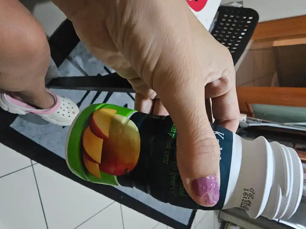 Akşam 15:30 yarım lahmacun, buzlukta. Çıkardığım bir dilim fırında mücver, bir kase patates kızartması, 5 erik, zencefil suyu