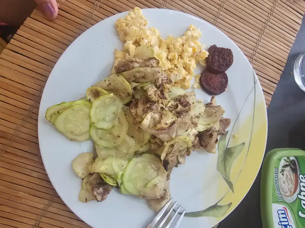 Kahvaltı 10.00 2 beyazdan omlet, 2 sucuk , kabak