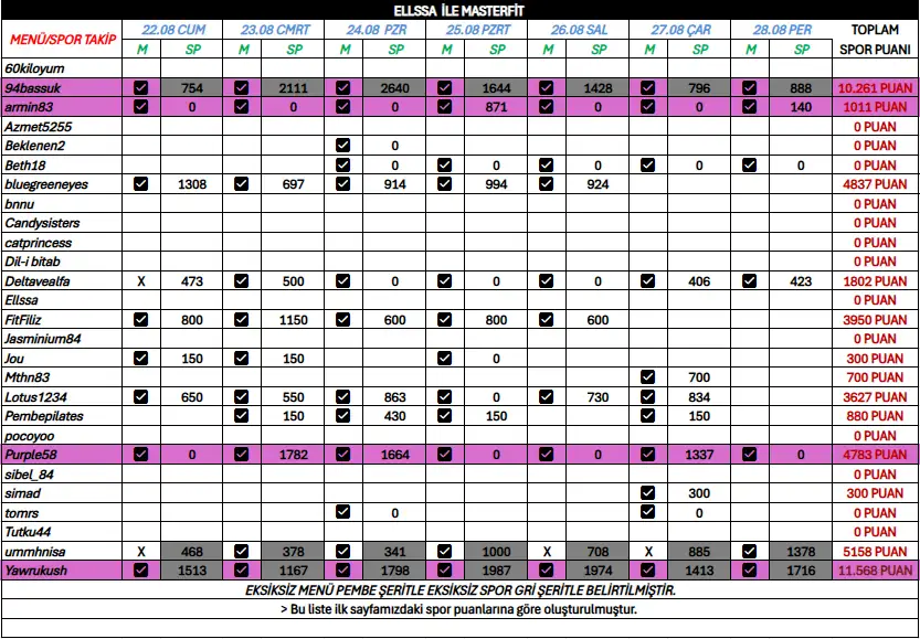 KIRMIZI TAKIM 22.08.2025 29.08.2025 FARK ORAN 94bassuk Kırmızı Takım Kaptanı 71.10 70.35 -0.750 1.054 @Purple58 102.50 101.90 -0.600 0.585 FitFiliz 79.10 79.30 +0.200 -0.252 Ellssa 74.50 - - 0 bluegreeneyes 65.35 64.85 -0.500 0.765 @Jasminium84 64.90 64.20 -0.700 1.078 @ummhnisa 83.10 83.00 -0.100 0.120 @Deltavealfa 70.80 69.70 -0.500 0.706 armin83 55.80 54.40 -1.400 2.508 TOPLAM ORAN 0.729 MAVİ TAKIM Jou Mavi Takım Kaptanı 71.80 70.20 -1.600 2.228 Beth18 70.10 - - 0 Yawrukush 75.85 75.05 -0.800 1.054 + 1 = 2.054 P Pembepilates 77.90 77.10 -0.800 1.026 @sibel_84 75.05 74.70 -0.350 0.466 B Beklenen2 77.35 - - 0 @Tutku44 90.50 89.80 -0.700 0.773 S simad 65.50 65.60 +0.100 -0.152 @Lotus1234 102.20 - - 0 TOPLAM ORAN 0.710 HAZIRLIK @60kiloyum 83.30 @cat princess 74.45 73.85 -0.600 0.805 @tomrs 62.65 @ZincirKirma -