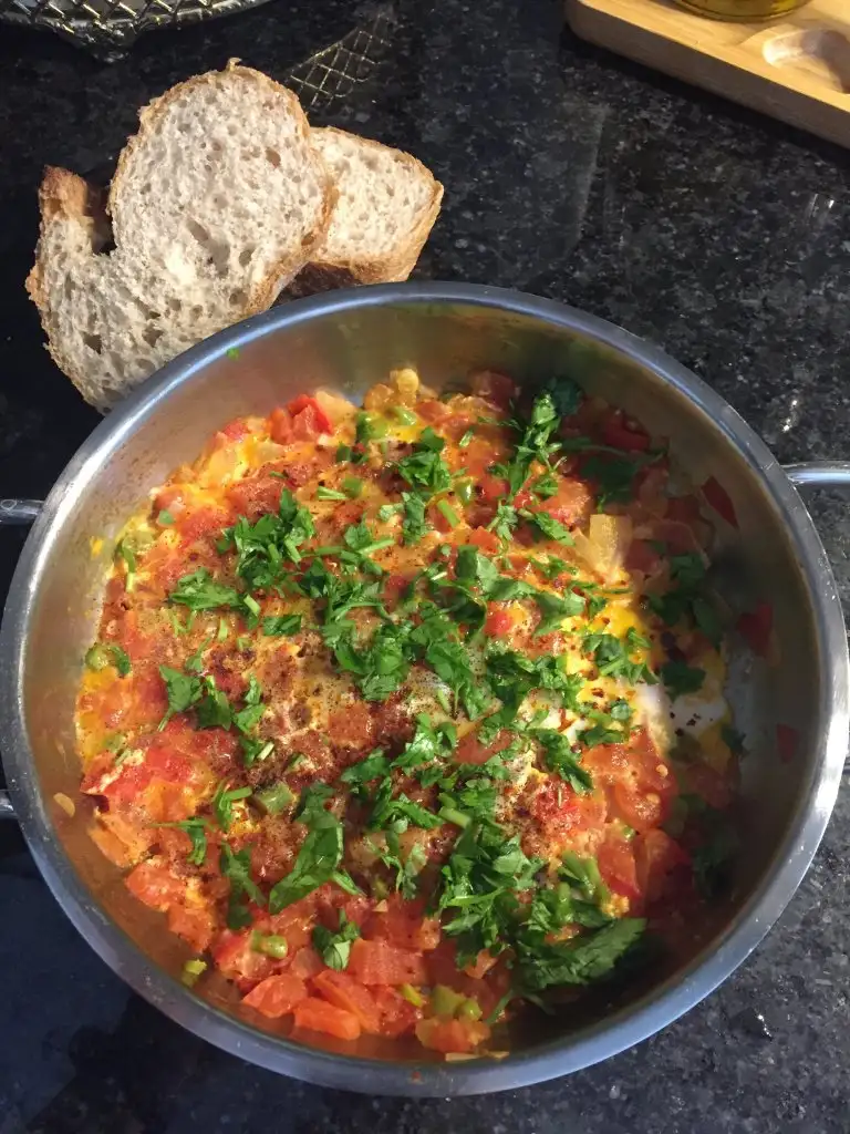 Menemen(1 tk yağ ile hazırladım)(1 yumurta,1 domates,1 minik kuru soğan,biber)