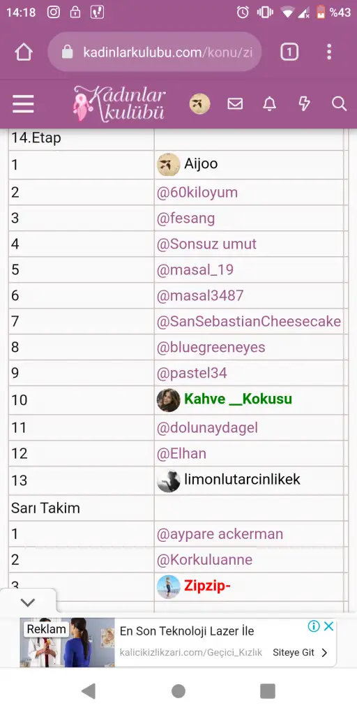 MasterFit 13.Etap Kırmızı Takım 10 Aralik 17 Aralik Fark Yuzde @fesang 62.1 63.4 +1.3 -2.09 @fittanne 87.4 87.9 +0.5 -0.57 @masal3487 69.9 69.1 0.8 1.14 @Korkuluanne 66.6 66.9 +0.3 -0.45 Kahve __Kokusu 56.4 56.15 0.25 0.44 @masal_19 57.8 57.7 0.1 0.17 -0.23 Hafta sonu adim avantaji %1 Hafta içi adım avantaji %1 Kırmızı Takım Ortalaması %0.11 Mavi takim 60kiloyum 85.4 83.9 1.5 1.76 dolunaydagel 89.3 89.0 0.3 0.34 Beth18 60.1 58.2 1.9 3.16 @LADY VEGA 61.8 61.4 0.4 0.65 @sulisim 55.5 54.5 1.0 1.80 Amine Busra 69.7 67.1 2.6 3.76 1.91 Duzenli menü bildirim avantaji %1 Mavi Takım Ortalaması %2.08 @eceboce 66.3 65.7 0.6 0.90 @Bal0ncuk 63.65 62.9 0.75 1.18 @Sonsuz umut 65 64.75 0.25 0.38 Hedef60kgolmak 62.6 64 +1.4 -2.24 HanimKelesimiGetir 62.35 @aytozuvegece 85.1 84 1.1 1.29 @bluegreeneyes 73.6 73.9 +0.3 -0.41 pastelfit 69.7