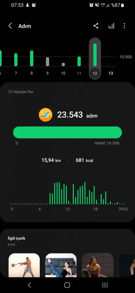 Su 2 litre spor 2 saat tempolu yürüyüş 15 bin küsur adom vardı ama ekran görüntüsü almayı unutup uyumuşum