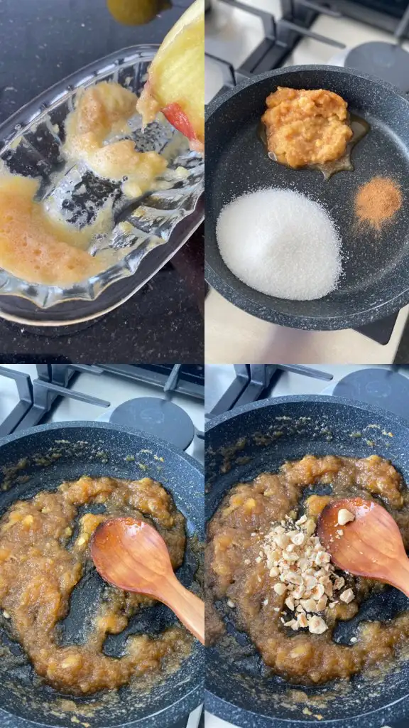 Öncelikle rendelediğimiz elmaları tavaya alıyoruz üstüne şekeri ve tarcını ilave edip suyu gidene kadar pişiriyoruz. Pişen iç harcın içine fındıkları ekleyip bir kenara alıp soğumaya bırakıyoruz.