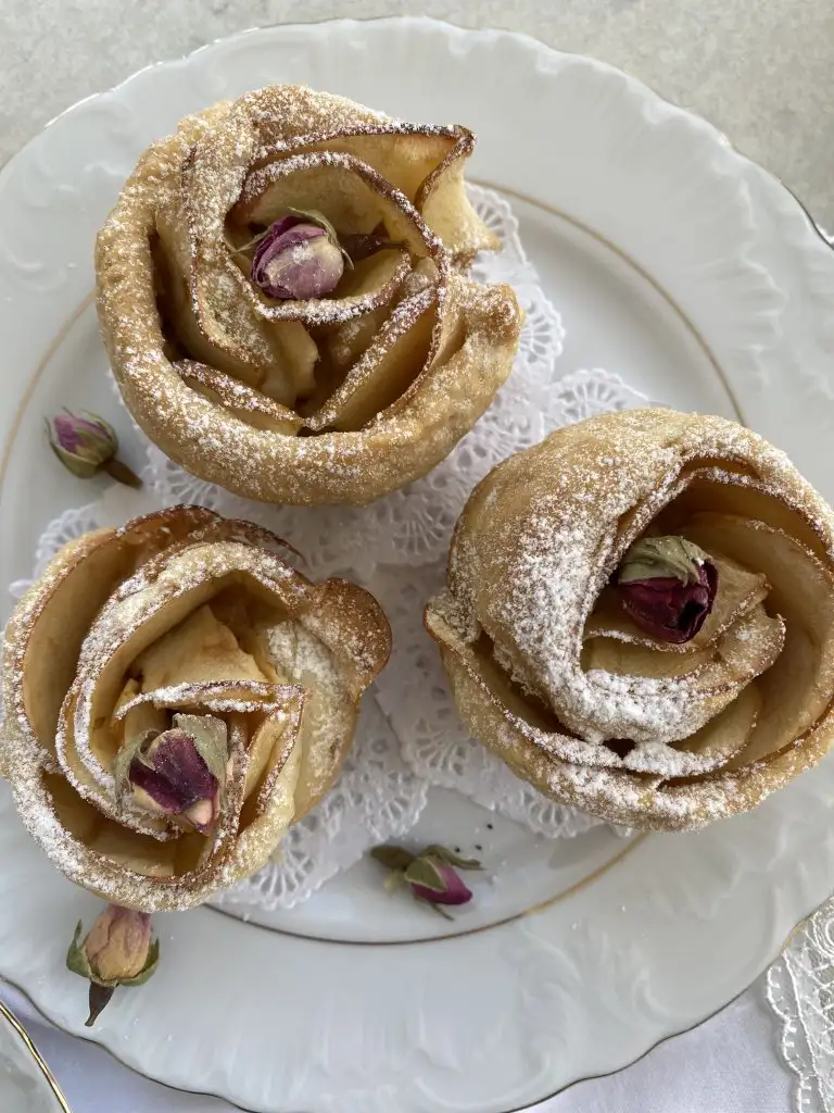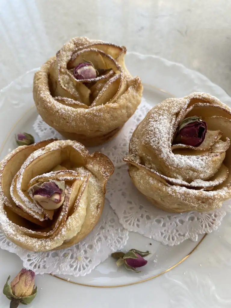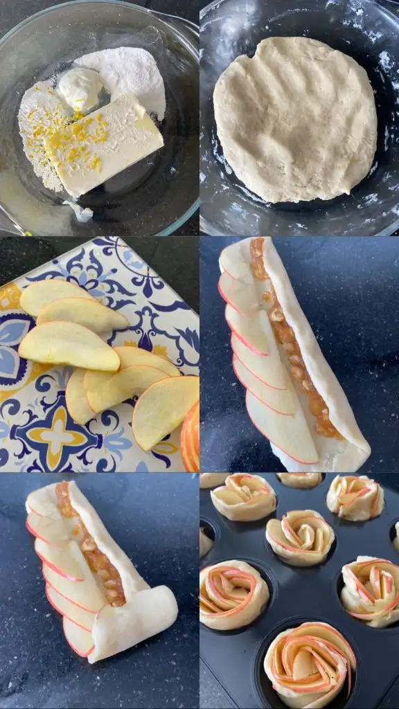 Hamurumuza dikdörtgen şekil verip iç harcından bir miktar koyuyoruz üstüne elma dilimleri ve yuvarlayıp gül görüntüsünü elde ediyoruz.