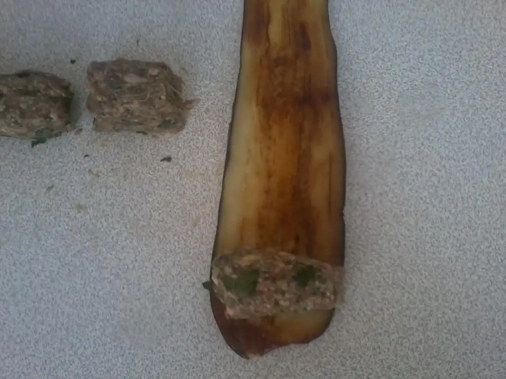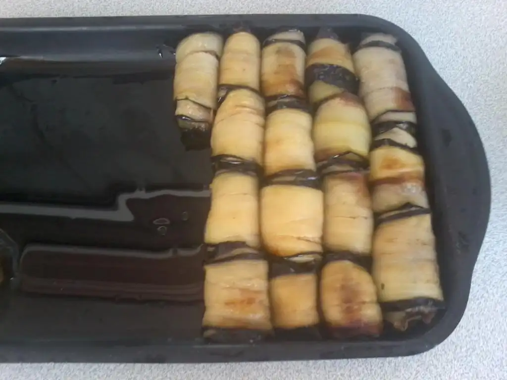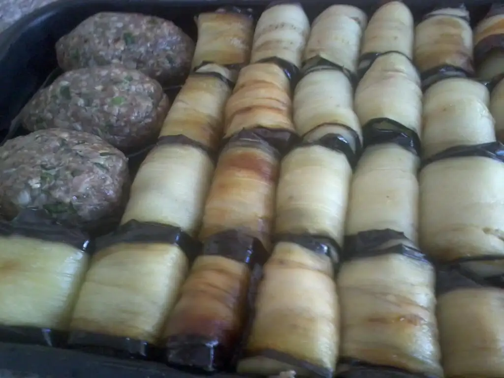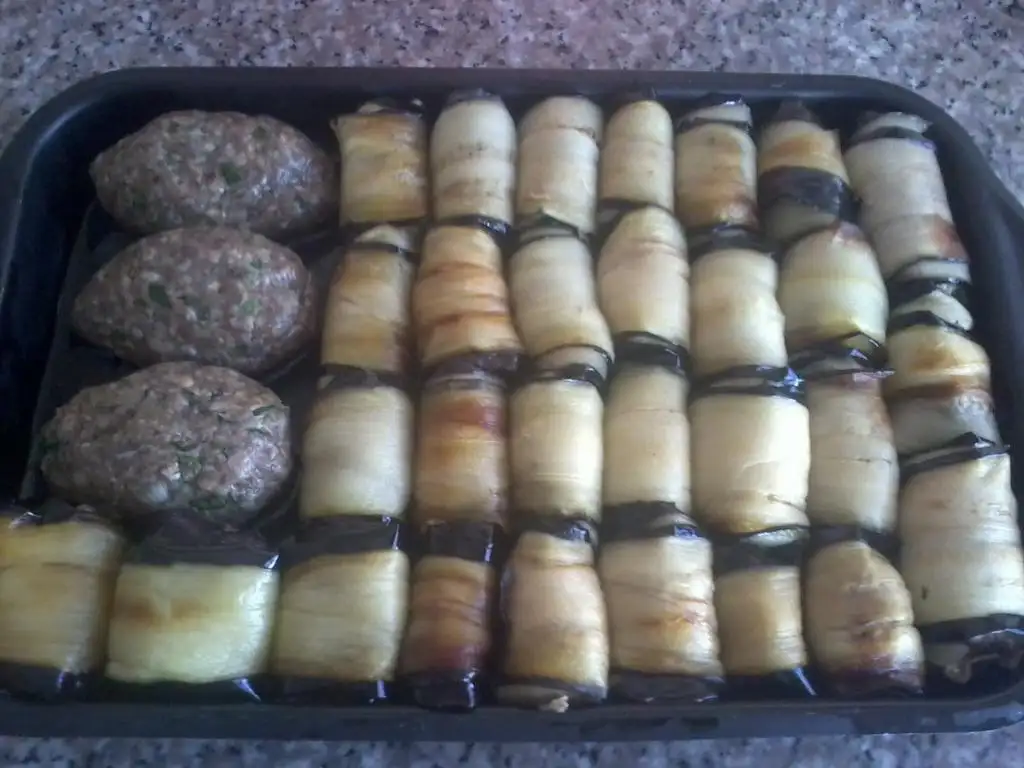 kızartmış olduğumuz patlıcanları tek tek masaya koyup hazırladığımız köfteyi rulo haline getirip parmak kalınlığında kesip,her bir patlıcanın ucuna köftemizden koyup rulo halinde sonuna kadar sarıyoruz..
