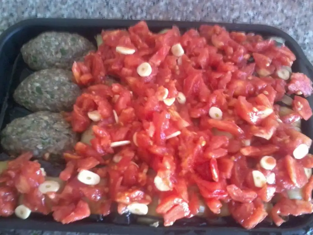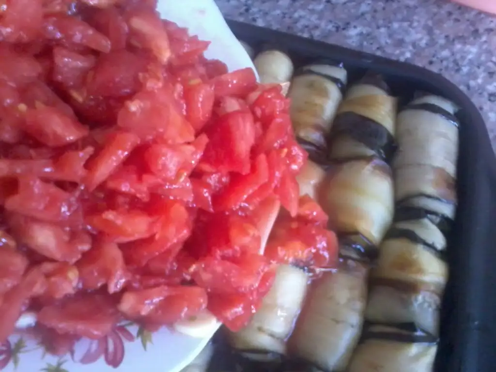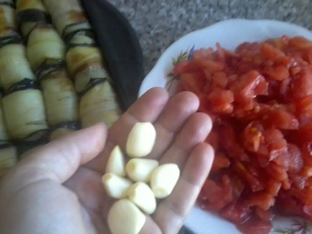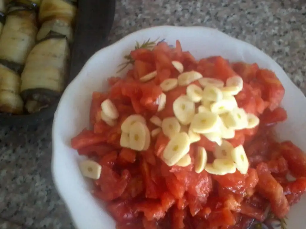 üzerine 3-4 domatesin kabuklarını soyup minik minik doğrayıp 4-5 diş sarmısakta ekleyerek patlıcan sarmalarının üzerine döküyoruz ve eşit şekilde dağıtıyoruz.