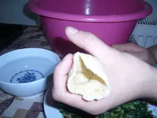 Bu arada yarmalı köfte harcının ele yapışmaması için bir tasa koyulan suyla eller ıslatılır. Her bir köfte topunun tepesinden işaret parmağıyla bastırıp oyuklar yapılır. Bu çukur kısımlara ıspanaklı kıymalı harç doldurularak, oyuk kısım bastırılarak kapatılır. Tekrar eski top köfteler şekline getirilir ve bir tepsiye dizilir.