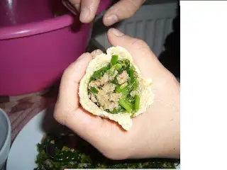Bir tavada eritilen tereyağına ilave edilen çok ince kıyılmış soğanlar sararıncaya kadar kavrulur. Hemen kıyma eklenerek kavurmaya devam edilir. Kıyma suyunu verip tekrar çekmeye başlarken haşlanmış ıspanaklar da ilave edilir ve sonra 2-3 dk daha kavrulup ateşten indirilir.Tuz ve karabiber atılarak lezzetlendirilir ve bir kenara bırakılır.