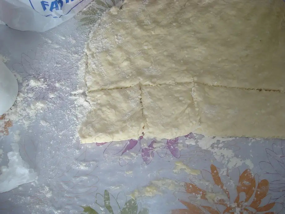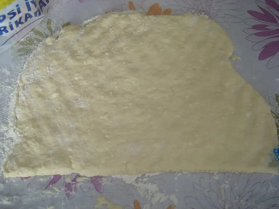 bütün malzemeler yoğrulur ,hamur düz bir zeminde açılır kare kare ruletle kesilip