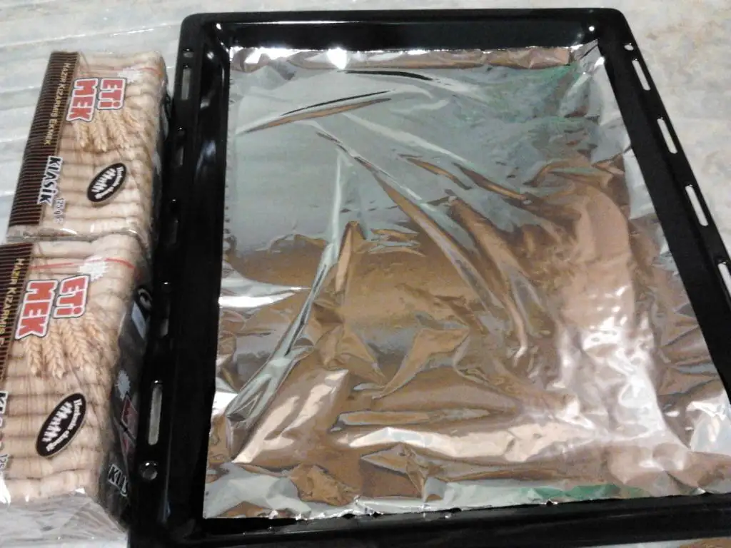 ardından yarım paket petibör bisküvide aynı şekilde parçalanıp koyulur