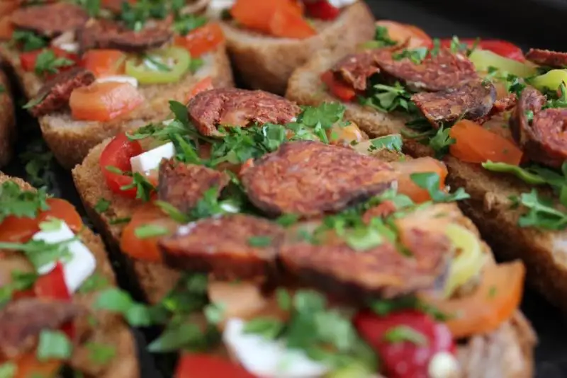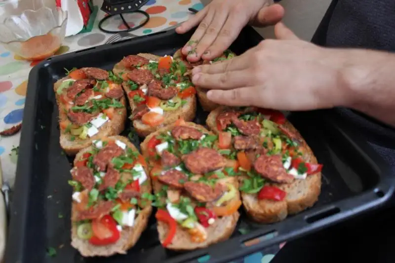 Ekmeğin üzerine Domates, biber, sucuk, mısır, maydanoz sıralanır. Yumurta ve salça karışımı üzerine gezdirilip fırına verilir. Pişmeye yakın kaşar eklenip eriyene kadar beklenir. Dilerseniz çıktıktan sonra tereyağı ile lezzetlendirebilirsiniz.