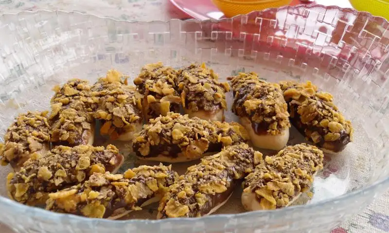 MISIR GEVREKLİ KURABİYE :300-400 GR kadar nişasta 2 yumurta 1çay b. toz şeker yarım pk margarin kabartma tozu 1 paket (bu bana verilen tarif ama zaman zaman tutturamıyorum o nedenle ben 200 gr nişasta geri kalanını kıvam alana kadar un koyorum bi sorun olmuyo ) hamur kıvamına getirip kalem kalınlıgında rulo yap kes küçük küçük üstü tam kızarmadan fırından çıkarıyoruz bu ölçüye bir pakete yakın çokokremi 2 yemek kaşıgı sıvıyag ile inceltiyoruz kurabiyelerin ön yüzünü soguyunca önce çikolataya sonra elimizle ufaladıgımız mısır gevreğine batirıp buz dolabında dinlendiriyoruz (ben kurabiyeleri pişirip küçük saklama kabı yada peynir kabına koyup buzluga atıyorum misafirim gelecekkende çıkarıp çikolata ve mısır gevregine buluyorum mis gibim oluyo tavsiye ederim)