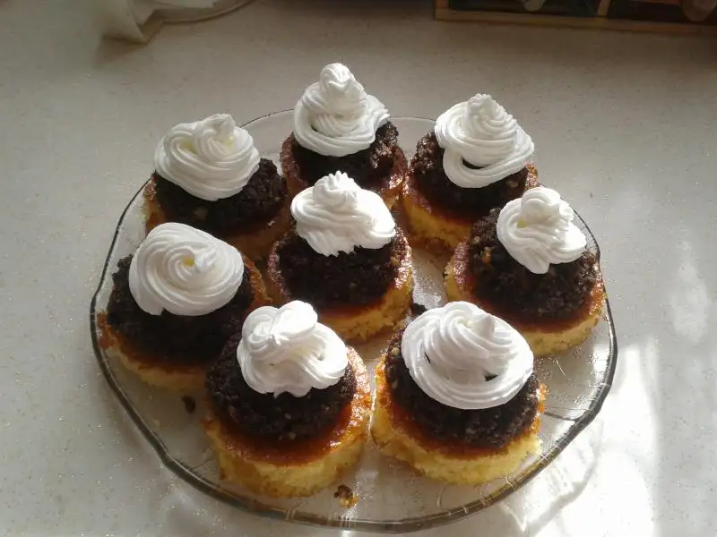 Şerbeti çekip , soğuduktan sonra yuvarlak kalıplarla kestim . Bardakla da olur . Benimkinden 8 tane çıktı. Kenarlarda kalan parçaları da elimde ufaladım , göz kararı kakao kattım , biraz da çekilmiş ceviz vardı onu koyup iyice birbirine karıştırdım . Her birinin üstüne köfte gibi yapıp koydum . En son da krem şanti ile süsledim. :)