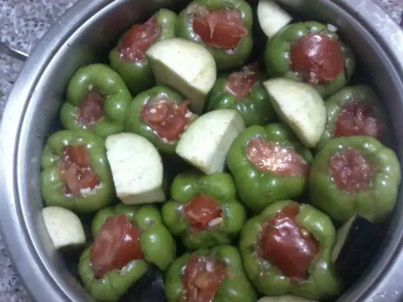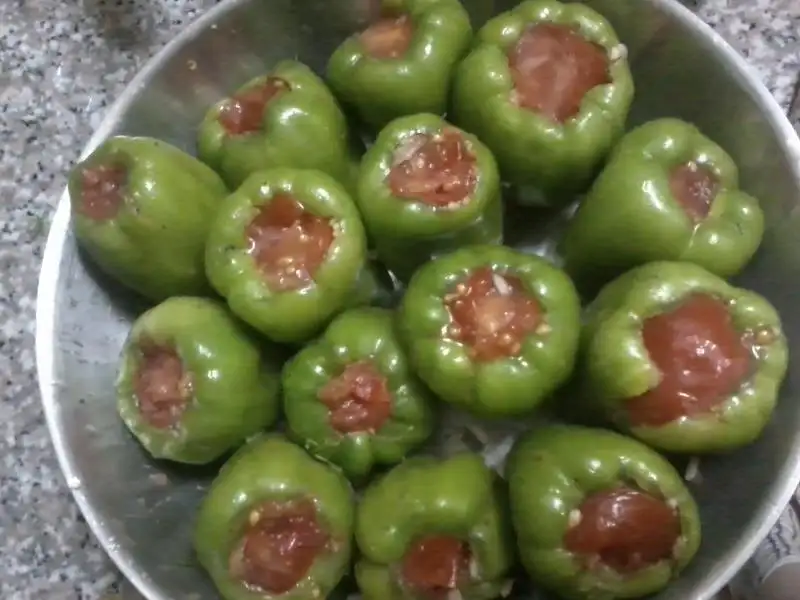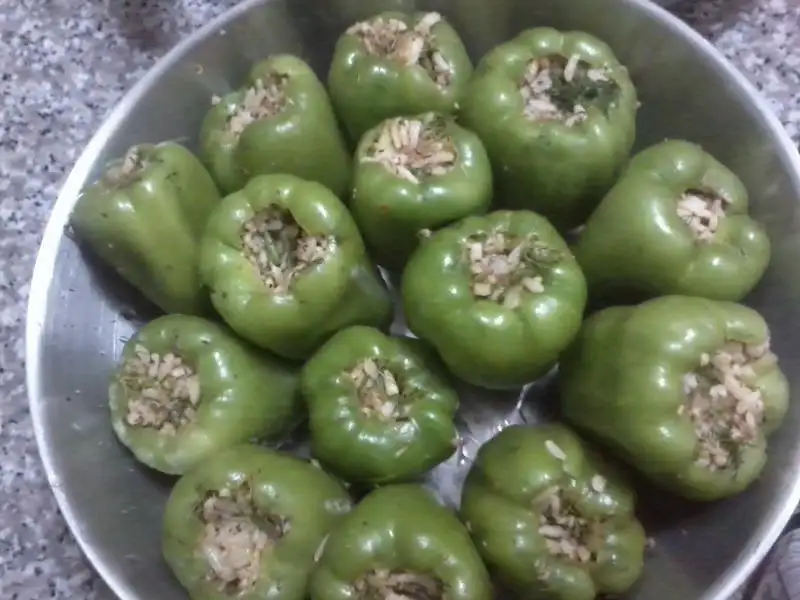 bende senle konuştuktan sonra kalktım dolma biberlerimi temizledim yıkadım hemen,kalan pilavımın içine soğanlı kıymayı ekledim,yarım demet dereotu ve yarım demek maydanoz doğradım,1 kuru soğan daha doğrayıp baharatlardan ekledim..taze nane yaprakları doğradım..biraz sıvı yağ ekleyip hepsini harmanladım ve biberlerimi doldurdum.ağızlarına da domates parçaları koydum irice.