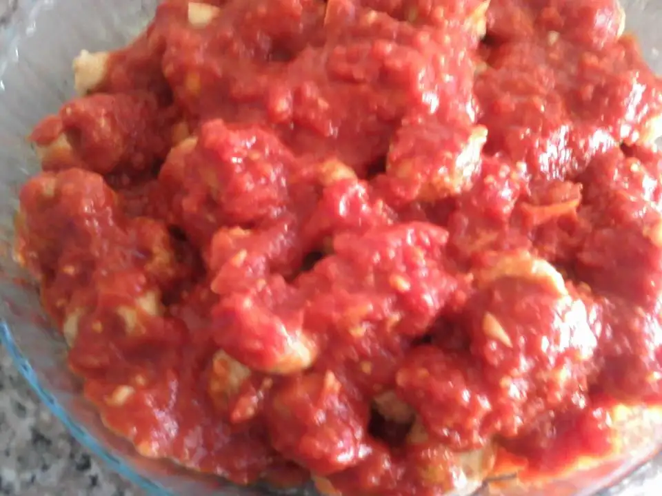 öte yandan rondoya kabukları soyulmuş 5-6 adet domates ve 3-4 diş sarmısağı ekleyip rondodan geçiriyorum püre haline geliyor..püreyi sos tencereme alıp üzerine 3-4 yemek kaşığı zeytinyağı ekleyip pişiriyorum..içerisine 1 yemek kaşığı domates salçası ve 1 yemek kaşığı biber salçası 1 tatlı kaşığı tuz ekleyip pişiriyorum..