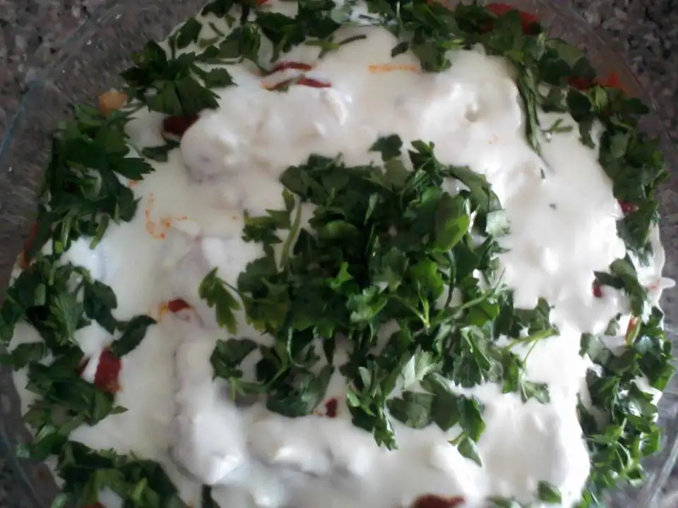 diğer yandan 1 büyük kase yoğurda 3-4 diş sarmısak ekleyip karıştırıyorum..ve sırasıyla köftelerin üzerine önce domates sosumu,sonra sarmısaklı yoğurdumu en son ise maydanozumu ekleyip soframa sunuyorum:)