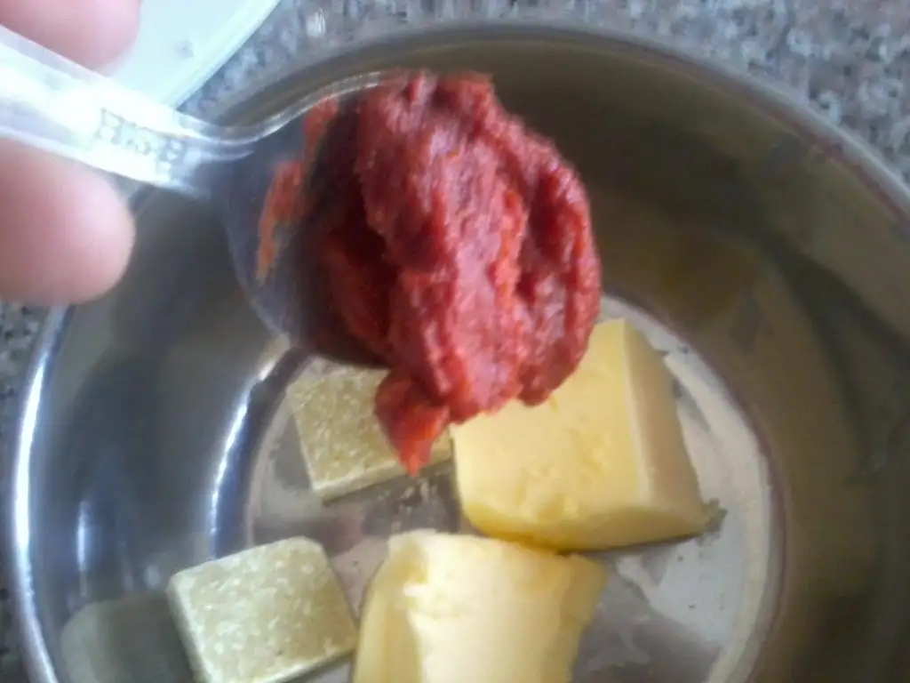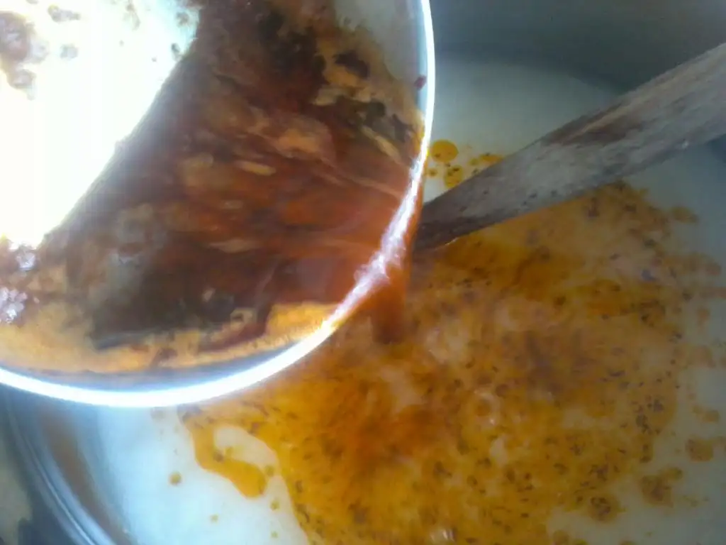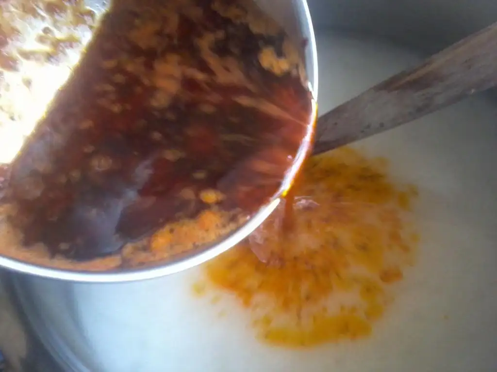 sos tenceremize 2 yemek kaşığı dolu dolu tereyağını,2 adet tavuk bulyonu,1 tatlı kaşığı domates salçasını,1 tatlı kaşığı biber salçasını,1 tatlı kaşığı naneyi,1 tatlı kaşığı pul biberi ekleyip içice köpük köpük olana kadar pişiriyoruz.böylelikle salçaların kokusuda kaybolmuş oluyor.sonra 1 kase kadar yoğurdu kaynamakta olan tarhanamıza hızlıca ekleyip yoğurdun kesilmemesi için elimizden geleni yapıyoruz
