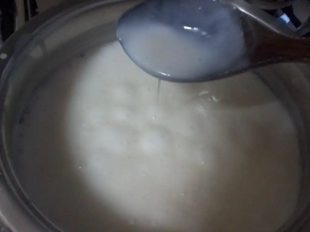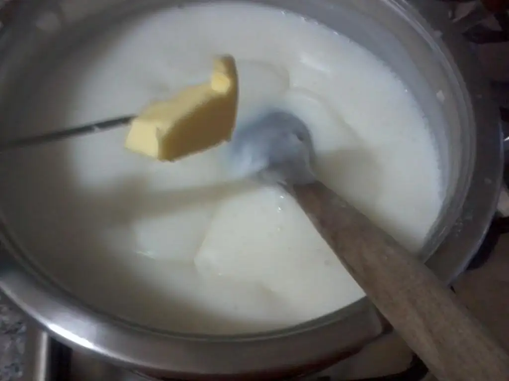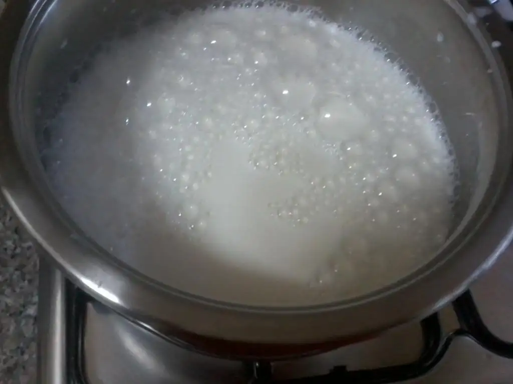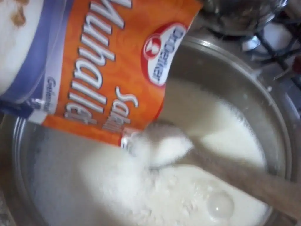 3,5 su bardağı süt ile muhallebimi pişirdim.göz göz olup koyulaşmaya başlayınca altını kapattım ve bi parça tereyağ ekleyip hızlıca karıştırdım yağı yedirdim..