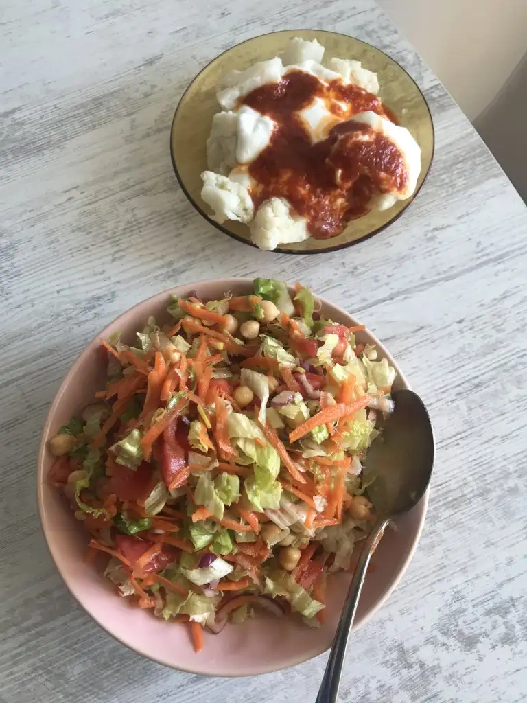 Şimdi öğle akşam birleşik yemeğim nohutlu salata ve karnıbahar ile yalancı mantı