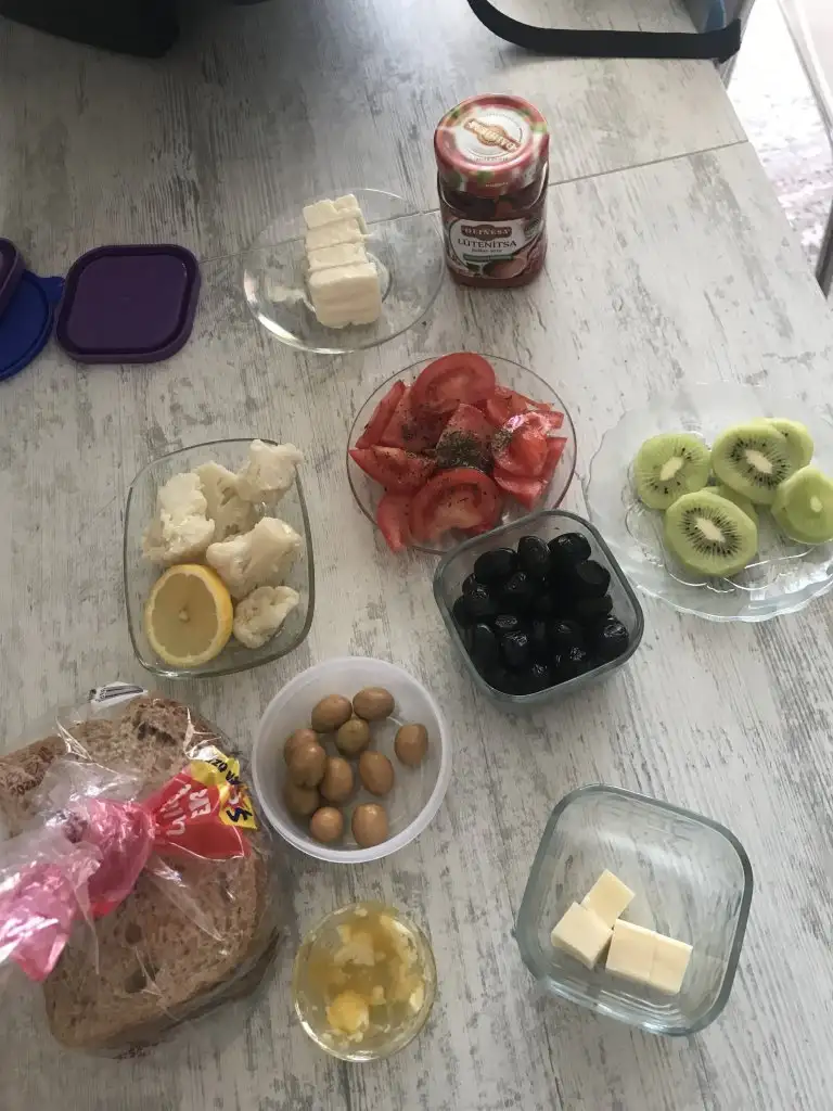 Sabah yumurta yemek istemedim dünden haşlanmış karnabahar vardı onu zeytinyağ ve limonla yedim. Domates peynir 3 zeytin kivi 1 dilim tam buğday, 1 kaşık tereyağ bal karışımı, 1 çay kaşığı domates sos yedim