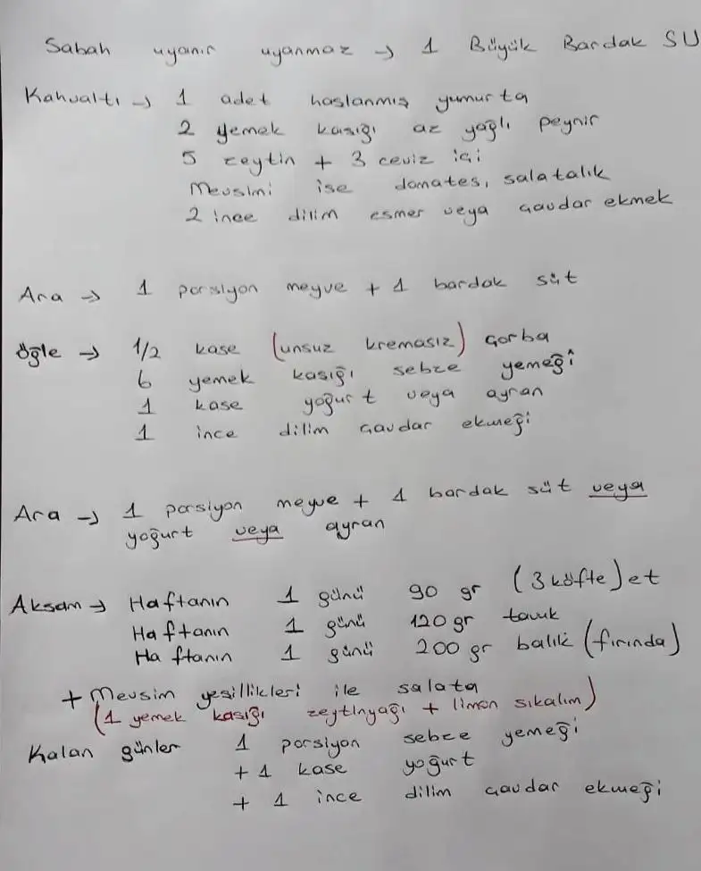 Canim emzirenler olarak diyet yemegi yenmesi gerekmiyor zaten. Makarna pilav vs konusunda haklisin onlari min. seviyede tutmaliyiz. Diyetisyenimin dedigine gore su an benim (bizim) yaptigim asla diyet degil saglikli beslenme. Zaten bana gore de emzirmenin ilk 1 yili en azindan cok sert diyetler yapilmamali. Sen nasil yapabiliyorsun dayaniyorsun onu da bilmiyorum ya da sutun etkilenmedi mi bilemiyorum. Ama sen de etkilenmedi diye baskasinda etkilenmeyecek degil tabi. Yanlis anlama kilo vermen cok iyi ve supersin bunyesel olarak mi hizli kilo veren yapin var yoksa cok fazla yemekten kistigin icin mi bilmiyorum. Ama ben eminim sadece senin beslendigin gibi beslensem de kilo verme hizim senin gibi olmazdi yani biraz da bunyesel. Buraya diyetisyenimin bana son attigi programi atiyorum kisiye ozel tabi uygulamak size kalmis ben pek uygulamiyorum acikcasi