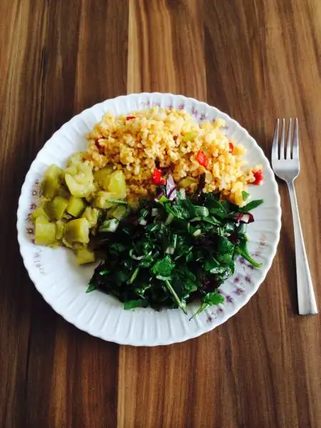 Bir tabakta bol sebzeli bulgur, bezelye , salata