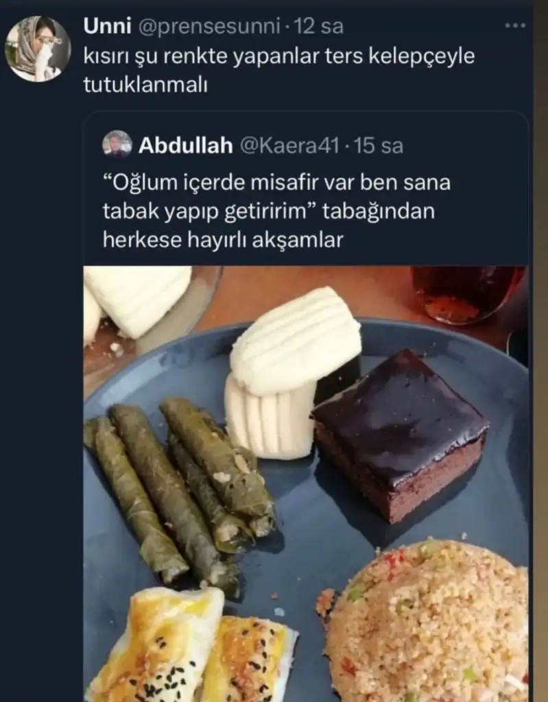 Zekta1 Per aspera ad astra 💫 Pro Üye Anneler Kulübü 9 Ekim 2021 6.134 12.610 198 30 15 Aralık 2023 Konu Sahibi Konu Sahibi Nevreste #3.736 Nane limon kabugu .!.: Öyle bulgur pilavı da kabul edilemez Genişletmek için tıkla... ASSOSyal .!.: Bulgur pilavını daha çok salça koyuyorum ben Genişletmek için tıkla... 40 yıllık kısırı da bozmuşlar