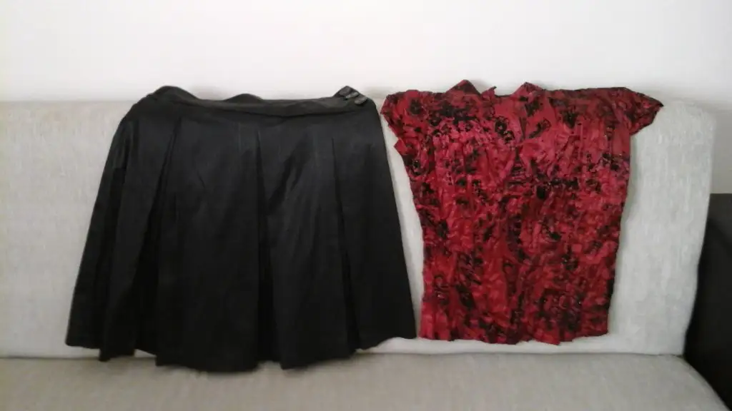 Vivit marka 42 beden takım etek beli lastikli şifon kumaş bluz tek kol diğer kol askılı uzun koldan yirtmac var 30tl