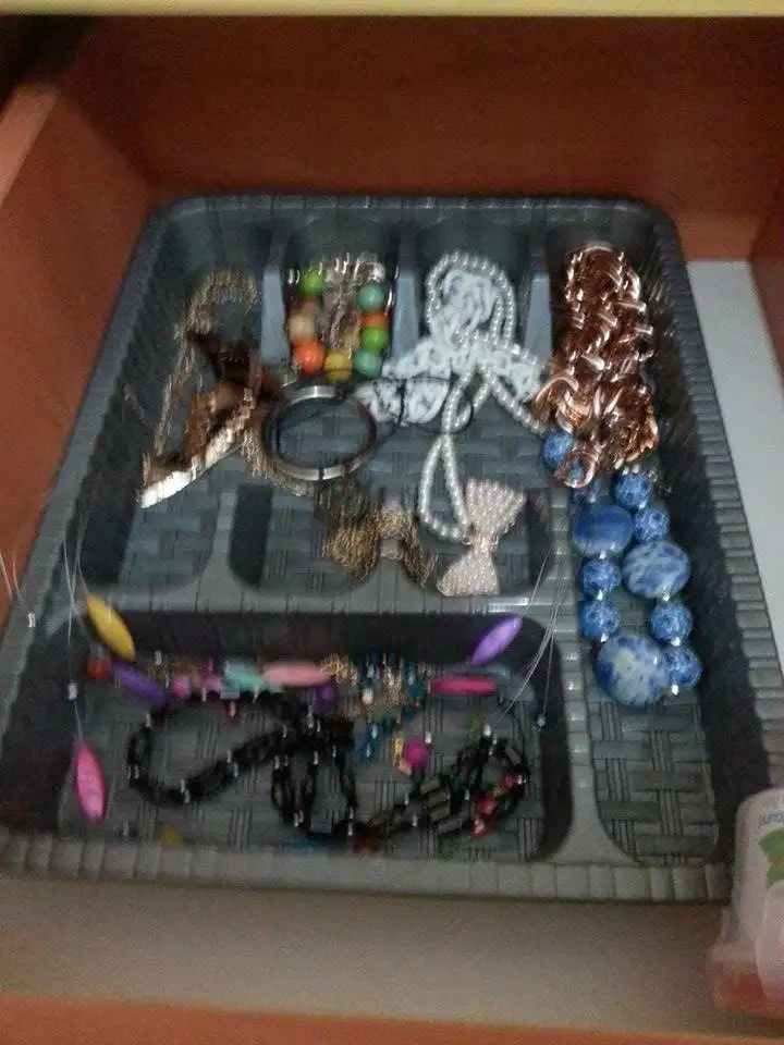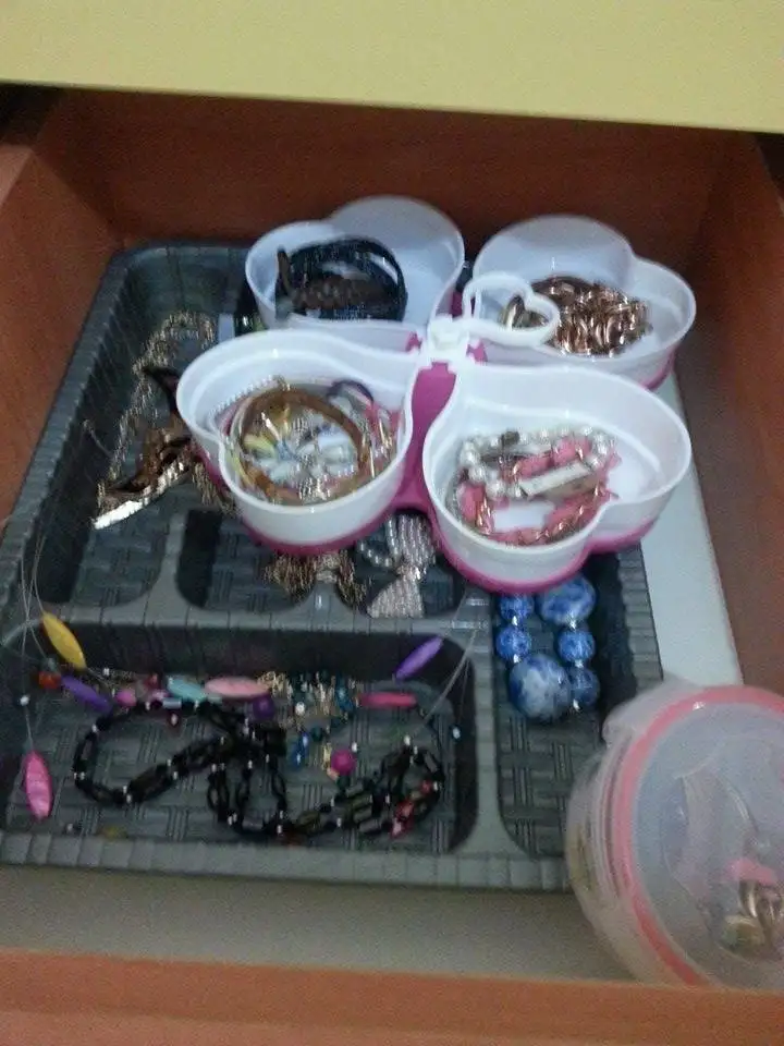 şimdi benim baya bi incik boncuk takım var bi takı askılığı almıştı kardeşim kitaplığımda duruyordı ama artık ona sığmıyorlar, kolyeler bileklikler bilezikler falan.