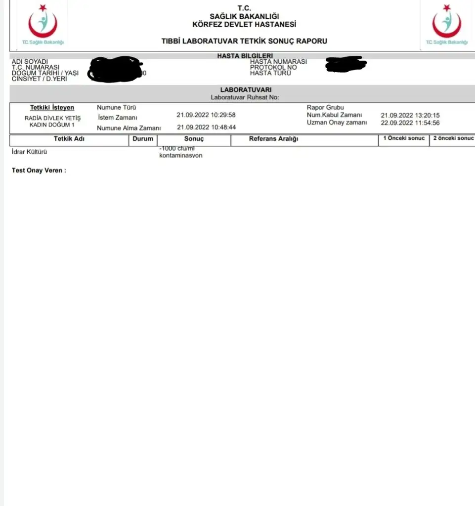 İdrar kültürü vermişsiniz ama kontamine olmuş. Bu yüzden testi tekrarlamanız gerek. Önce ilk idrarınızı yapacaksınız, sonra önden arkaya mendille sileceksiniz; sonra size verilen petri kabına idrarınızın orta ve son kısmını yapıp, kapağı kapatacaksınız. Cok geçmiş olsun.